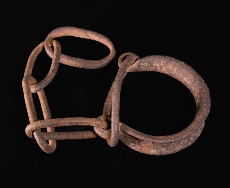 About this objectHobble for restraining horses. It would be put around fetlock so chain drags behind. If horse tries to move off its hind leg it will stand on chain. From Algers blacksmiths.