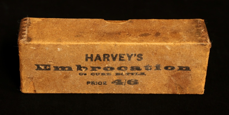 Box lid: 'Harvey's embrocation or curb bottle, price 4/6'