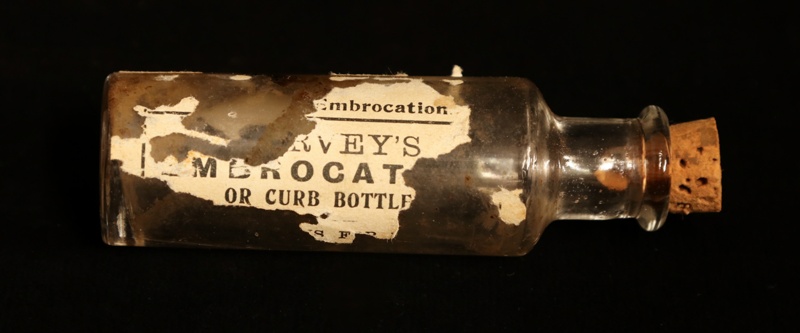 About this objectThis was used by the donor and his father, at their West Bergholt farm during the 1930's and 1940's. It would be rubbed onto the horse where, for example, a muscle had been strained. The embrocation was contained in the corked, glass bottle, parts of the label of which remain. It is marked: "For horses and cattle". However, this was probably used solely for horses, since the father was a horse-breaker as well as a farmer. The bottle is contained in a brown cardboard box, the lid of which is marked "HARVEY'S EMBROCATION or CURB BOTTLE, PRICE 4/6". Cotton wool originally formed a padding at one end of the box - this has been discarded due to deterioration.
