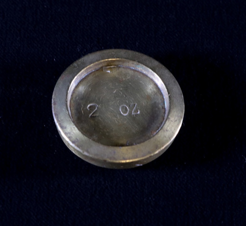 About this objectA 2 oz weight. This object is one of a complete set of nine different weights, all of varying sizes and materials (ranging from 4 lbs to 1/4 oz). The weights came with a set of iron scales. At the base of the scales is an integral tray with sections for storing the weights in their correct sequence. The scales also came with a separate, oblong tray and all of the items were given to the donor by the daughter of the village policeman.