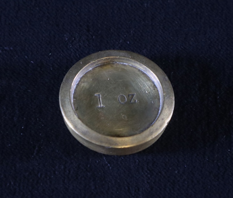 About this objectA 1 oz weight. This object is one of a complete set of nine different weights, all of varying sizes and materials (ranging from 4 lbs to 1/4 oz). The weights came with a set of iron scales. At the base of the scales is an integral tray with sections for storing the weights in their correct sequence. The scales also came with a separate, oblong tray and all of the items were given to the donor by the daughter of the village policeman.