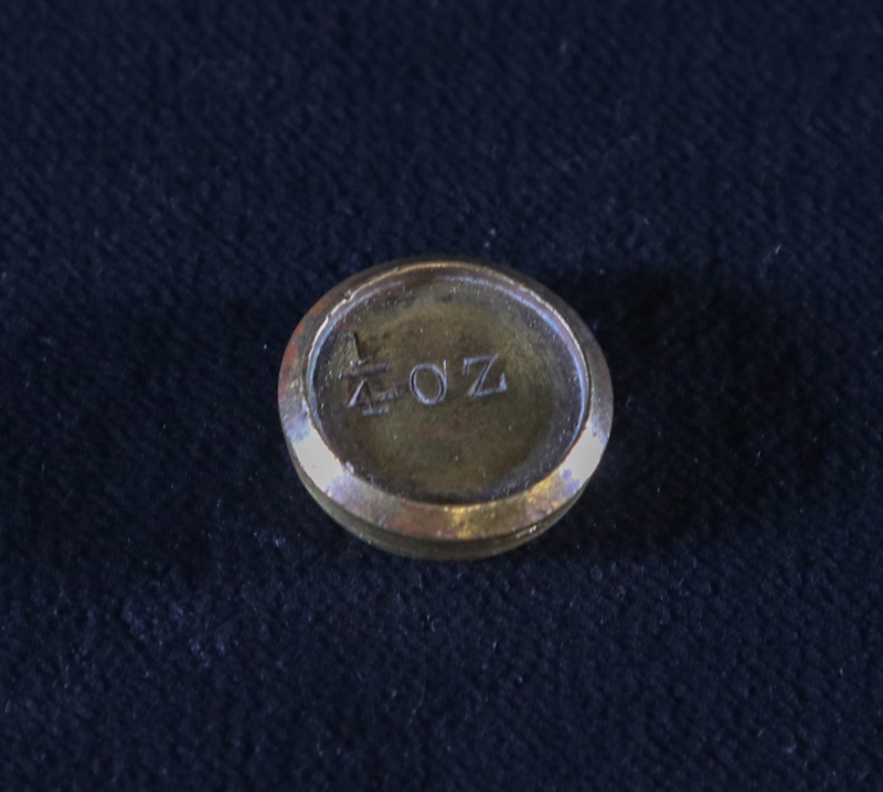 About this objectA 1/4 oz weight. This object is one of a complete set of nine different weights, all of varying sizes and materials (ranging from 4 lbs to 1/4 oz). The weights came with a set of iron scales. At the base of the scales is an integral tray with sections for storing the weights in their correct sequence. The scales also came with a separate, oblong tray and all of the items were given to the donor by the daughter of the village policeman.