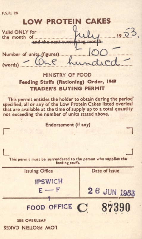 About this objectOne of eight Rationing Coupons issued by the Ministry of Food under the feeding stuffs (rationing) order 1949. Each constituting a traders buying permit and issued respectively in April, June and July 1953. This coupon is for low protein cakes.