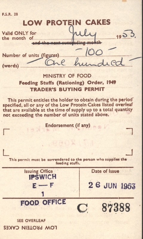About this objectOne of eight Rationing Coupons issued by the Ministry of Food under the feeding stuffs (rationing) order 1949. Each constituting a traders buying permit and issued respectively in April, June and July 1953. This coupon is for low protein cakes.