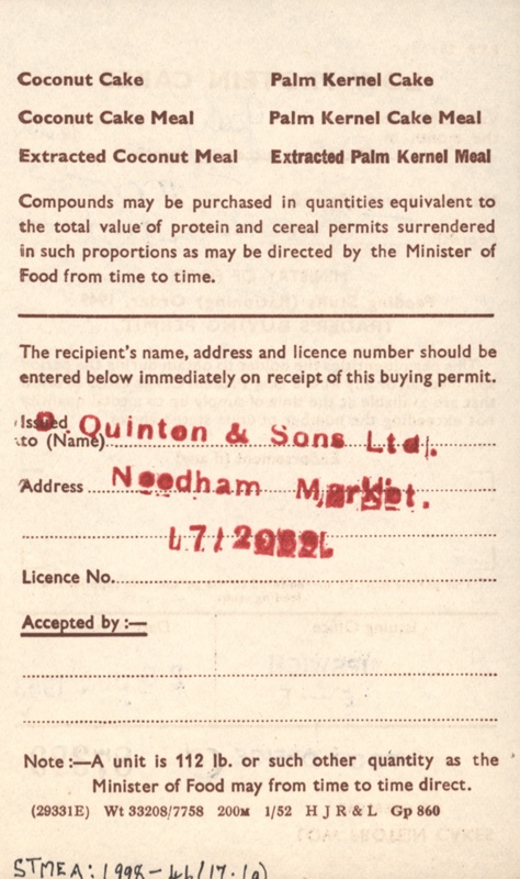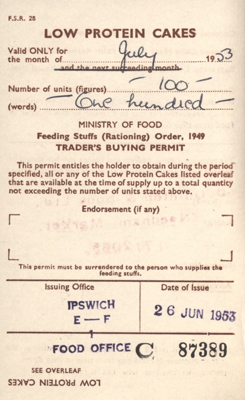 About this objectOne of eight Rationing Coupons issued by the Ministry of Food under the feeding stuffs (rationing) order 1949. Each constituting a traders buying permit and issued respectively in April, June and July 1953. This coupon is for low protein cakes.