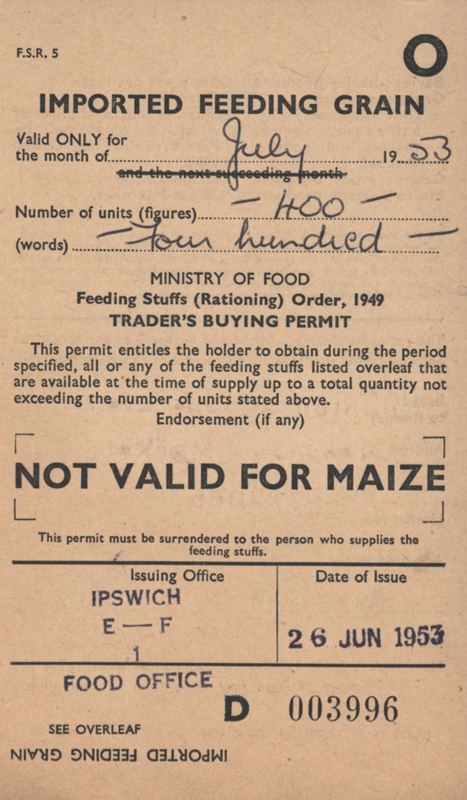 About this objectOne of seven Rationing Coupons issued by the Ministry of Food under the feeding stuffs (rationing) order 1949. Each constituting a traders buying permit and issued respectively in June and July 1953. This coupon is associated with imported feeding grain but not valid for maize.