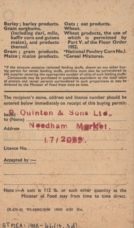 About this objectOne of seven Rationing Coupons issued by the Ministry of Food under the feeding stuffs (rationing) order 1949. Each constituting a traders buying permit and issued respectively in June and July 1953. This coupon is associated with imported feeding grain but not valid for maize.