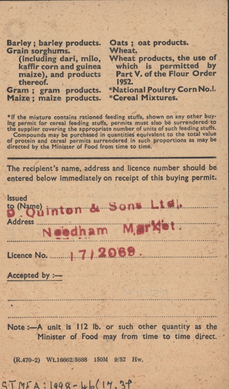 About this objectOne of seven Rationing Coupons issued by the Ministry of Food under the feeding stuffs (rationing) order 1949. Each constituting a traders buying permit and issued respectively in June and July 1953. This coupon is associated with imported feeding grain but not valid for maize.