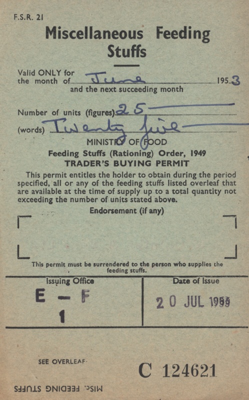 About this objectOne of three Rationing Coupons issued by the Ministry of Food under the feeding stuffs (rationing) order 1949. Each constituting a traders buying permit and issued respectively in June and July 1953. This coupon is associated with miscellaneous feeding stuffs.
