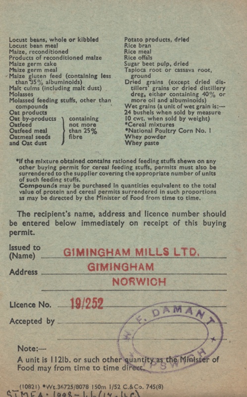 About this objectOne of three Rationing Coupons issued by the Ministry of Food under the feeding stuffs (rationing) order 1949. Each constituting a traders buying permit and issued respectively in June and July 1953. This coupon is associated with miscellaneous feeding stuffs.