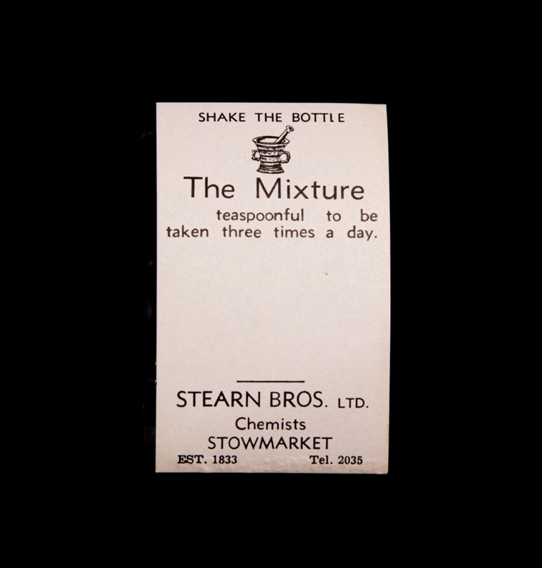 About this objectOblong shaped gummed label. At the top of the label is the name of the product and underneath the name is the dosage instructions. The middle part to the label is blank, and at the bottom of the label is the chemist's name.