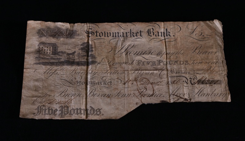 About this objectA white £5 issued by Stowmarket bank in 1826. Serial numbers: A6301 : H7116 : H7117 : H7118