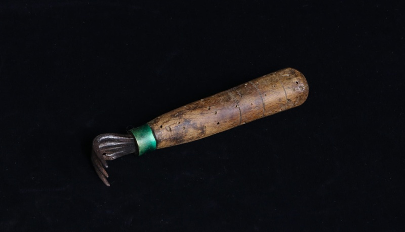 About this objectThe head has 4 teeth, with 1 broken. It is curved at right angles.