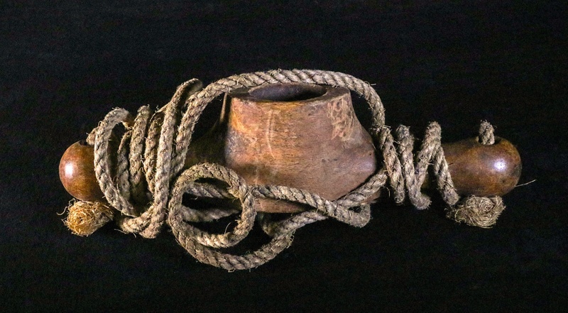About this objectThe donor, Mr Cabban, a retired vet, used the instrument in his practice. This wooden mouth gag is 275mms. long, with a rope measuring 2.90m, threaded through the holes at both of the rounded ends of the gag. The rope is 7.5mm in diameter. The central hole of the mouth gag is 40mm in diameter. This was used for cattle, with a probang.
