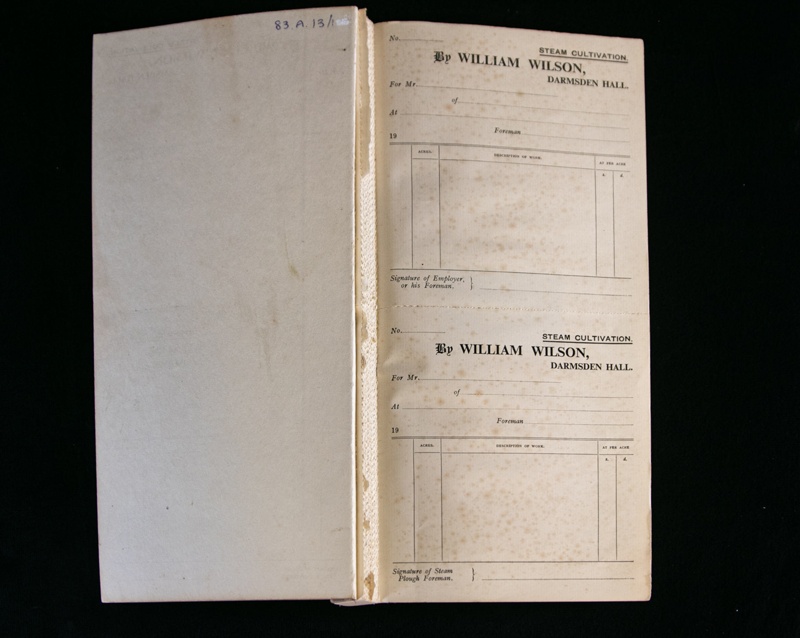 About this objectThis invoice book was used by the donor's father, Mr. William Wilson, Darmsden Hall, when hiring out for steam cultivating and for threshing, with only one double page of the invoice remaining, the rest having been torn from the perforated edge.