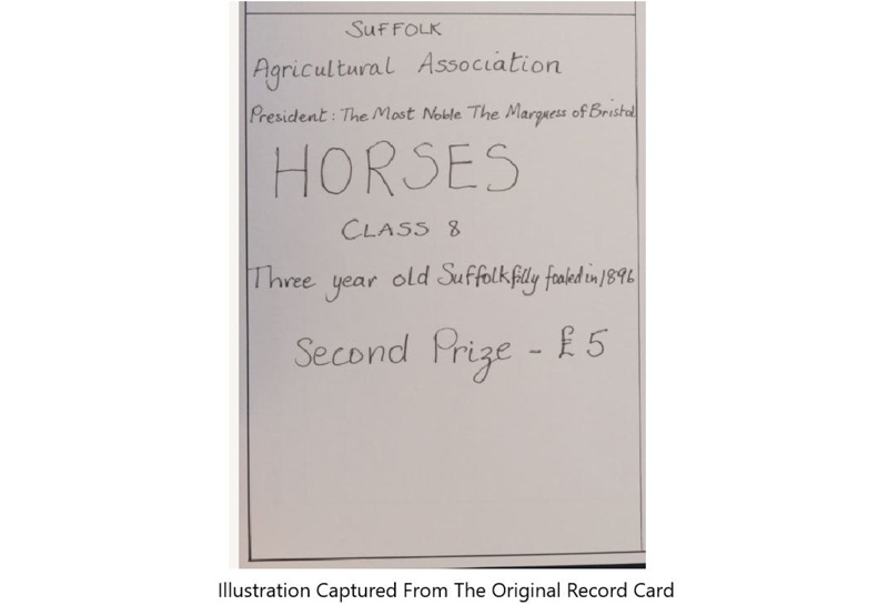 Inscription and MarksThe printed inscription reads: Suffolk Agricultural Association. President: The Most Noble The Marquess of Bristol. HORSES Class 8. Three Year Old Suffolk Filly Foaled in 1896. SECOND PRIZE - £5'.