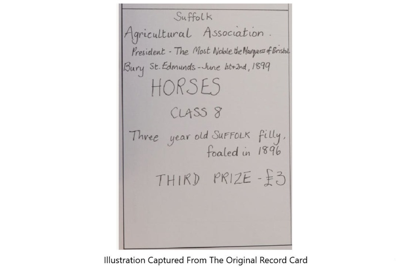 Inscription and MarksThe printed inscription reads: 'Suffolk Agricultural Association. President: The Most Noble The Marquess of Bristol. Bury St. Edmunds - June 1st & 2nd 1899. HORSES Class 8. Three Year Old Suffolk Filly Foaled in 1896. THIRD PRIZE - £3'.