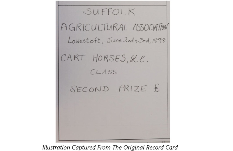 The printed inscription reads; 'SUFFOLK Agricultural Association. LOWESTOFT, June 2nd & 3rd 1898. CART HORSES ETC. Class. SECOND PRIZE £.'