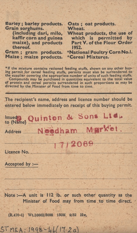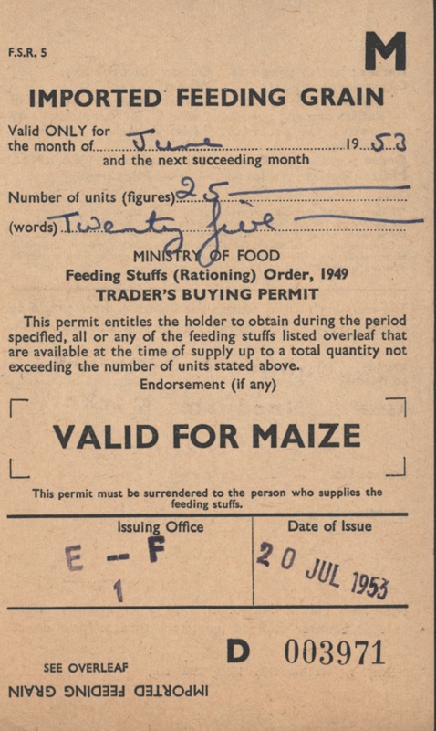 About this objectOne of three Rationing Coupons issued by the Ministry of Food under the feeding stuffs (rationing) order 1949. Each constituting a traders buying permit and issued respectively in June and July 1953. This coupon is associated with imported feeding grain and valid for maize.