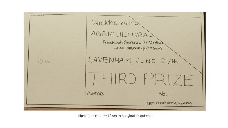 About this objectA certificate for third prize at the Wickhambrook Agricultural Associations' Lavenham show, held on the 27th of June 1936. It is faded green cardboard with the upper right corner torn off. Upon it is printed: