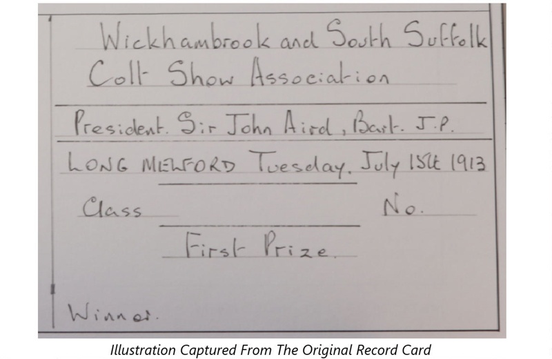 About this objectA faded red certificate for First prize at the Wickhambrook and South Suffolk Colt Show Association's Long Melford show held on the 15th of July 1913.
